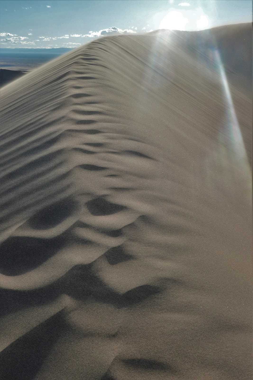 When I think of sand dunes, it’s the Oregon coast that comes to mind, certainly not Colorado! Why is there a 30-mile long dune field, with the tallest sand dunes in North America (750 feet!) in the middle of Colorado?? Well, it’s called the “Magnificent Coincidence”. Most of the sand comes from erosion in the San Juan Mountains 65 miles to the north. Prevailing southwesterly winds carried the sand to a shallow bend at the base of the Sangre de Cristo Mountains. Near the mountains the wind patterns become more complex, blowing the sand back onto itself and forming the dunes. Two seasonal streams wrap around the margins of the dunes depositing sand, which is picked up by the wind and redeposited in the dunes. Pretty wild that just the right circumstances of wind, water and earth conspired to create such a natural wonder!
